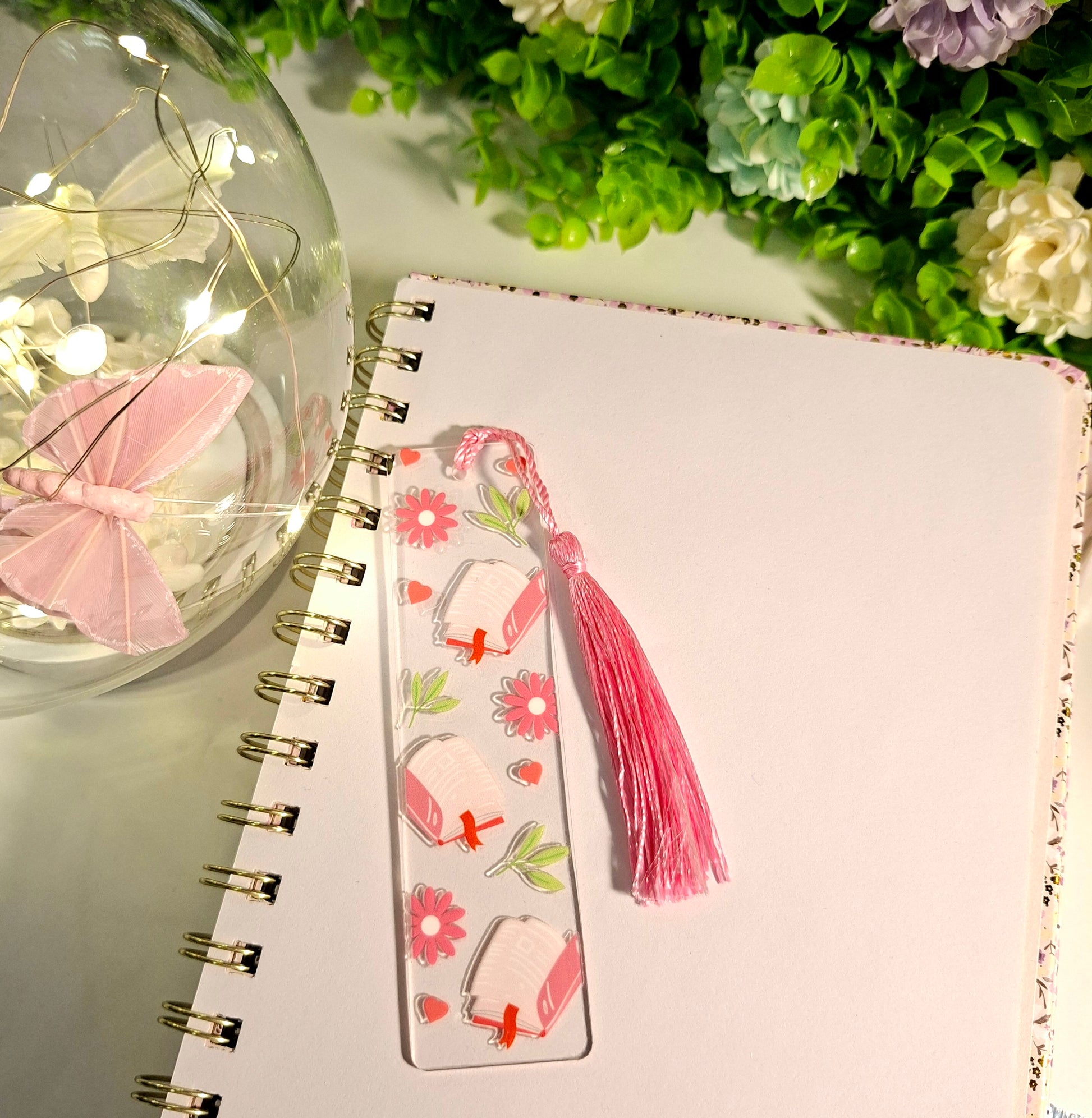 Delikatna zakładka do książki z motywem otwartych książek i kwiatów, wykończona subtelnym frędzlem.