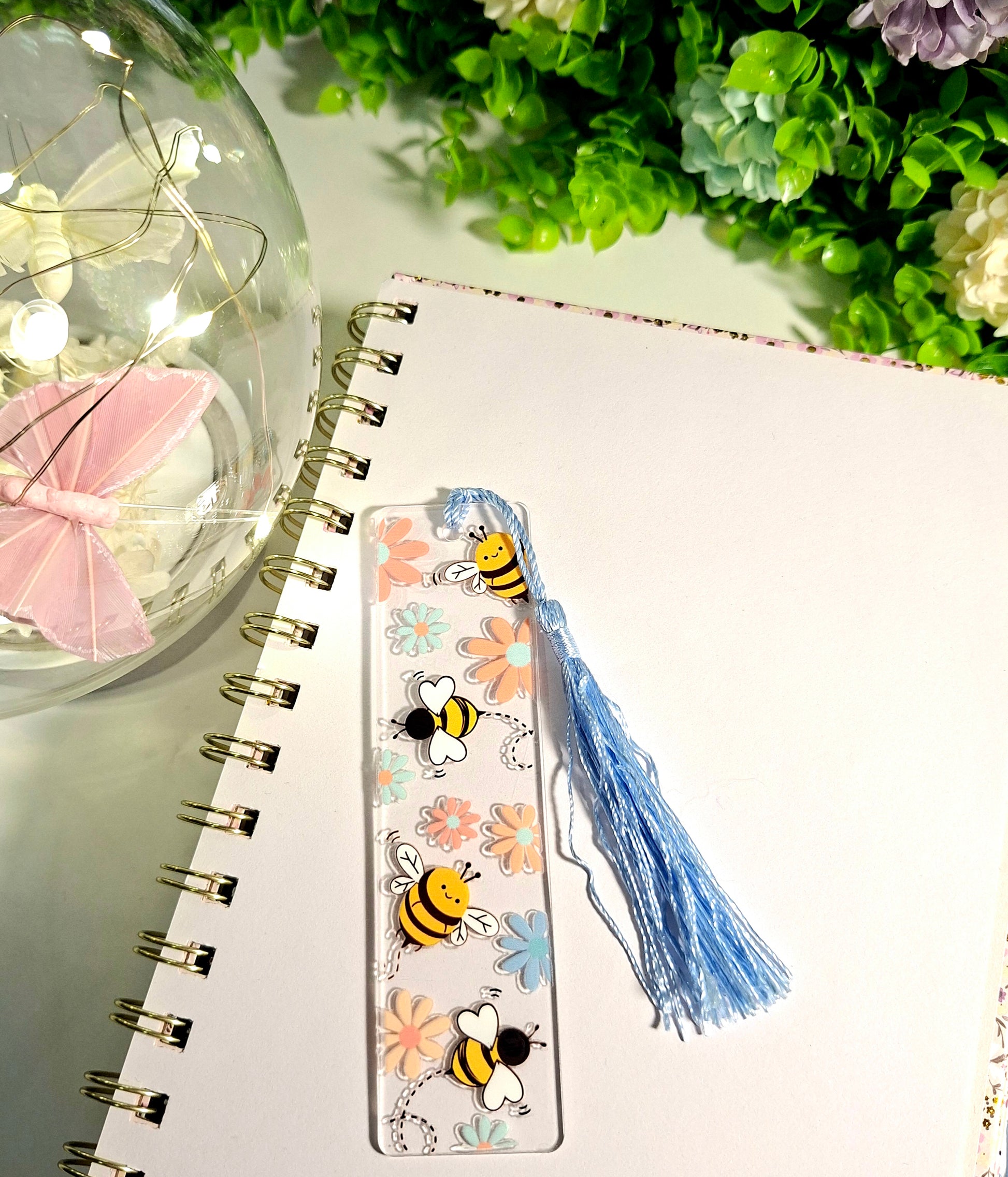 Urocza zakładka do książki z motywem pszczółek i pastelowych kwiatów, wykończona delikatnym frędzlem.